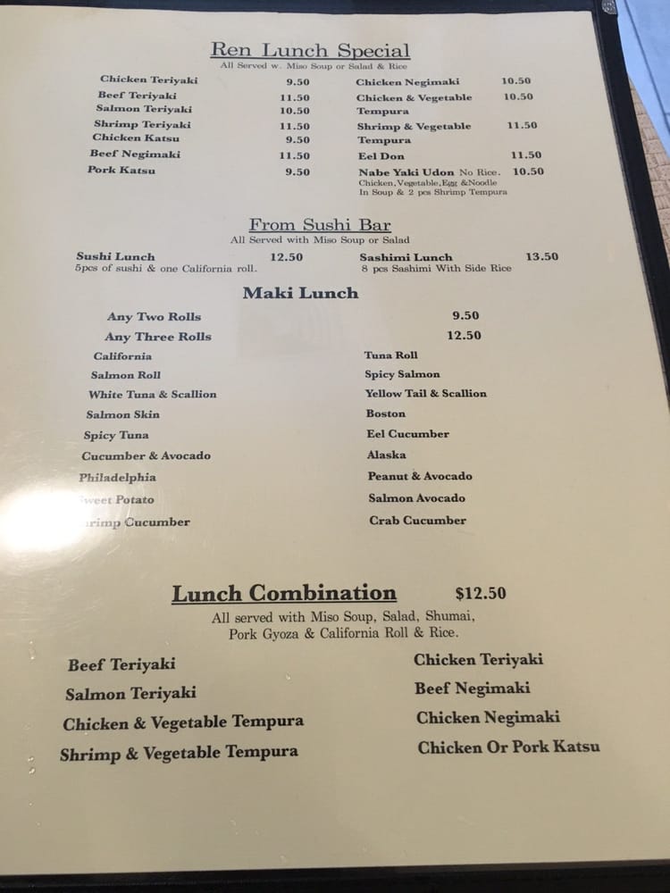 Sushi Ren, located in New York City, offers a diverse menu of Japanese cuisine with a focus on fresh and delicious sushi. The lunch combinations include options like Chicken Teriyaki, Beef Negimaki, and Shrimp Tempura. Special lunch sets feature Teriyaki options and Sushi/Sashimi combos. Customers praise the restaurant for its consistently fresh and flavorful dishes, with highlights like the California Roll, Eel, and Shrimp Shumai. The peaceful ambiance and attentive service make dining in or ordering takeout a pleasant experience. The menu caters to various preferences, from sushi enthusiasts enjoying rolls like Spider Roll and Twin Salmon Avocado, to those seeking traditional Japanese dishes like Miso Soup. Sushi Ren is a go-to spot for quality sushi and Japanese cuisine on the Upper East Side.